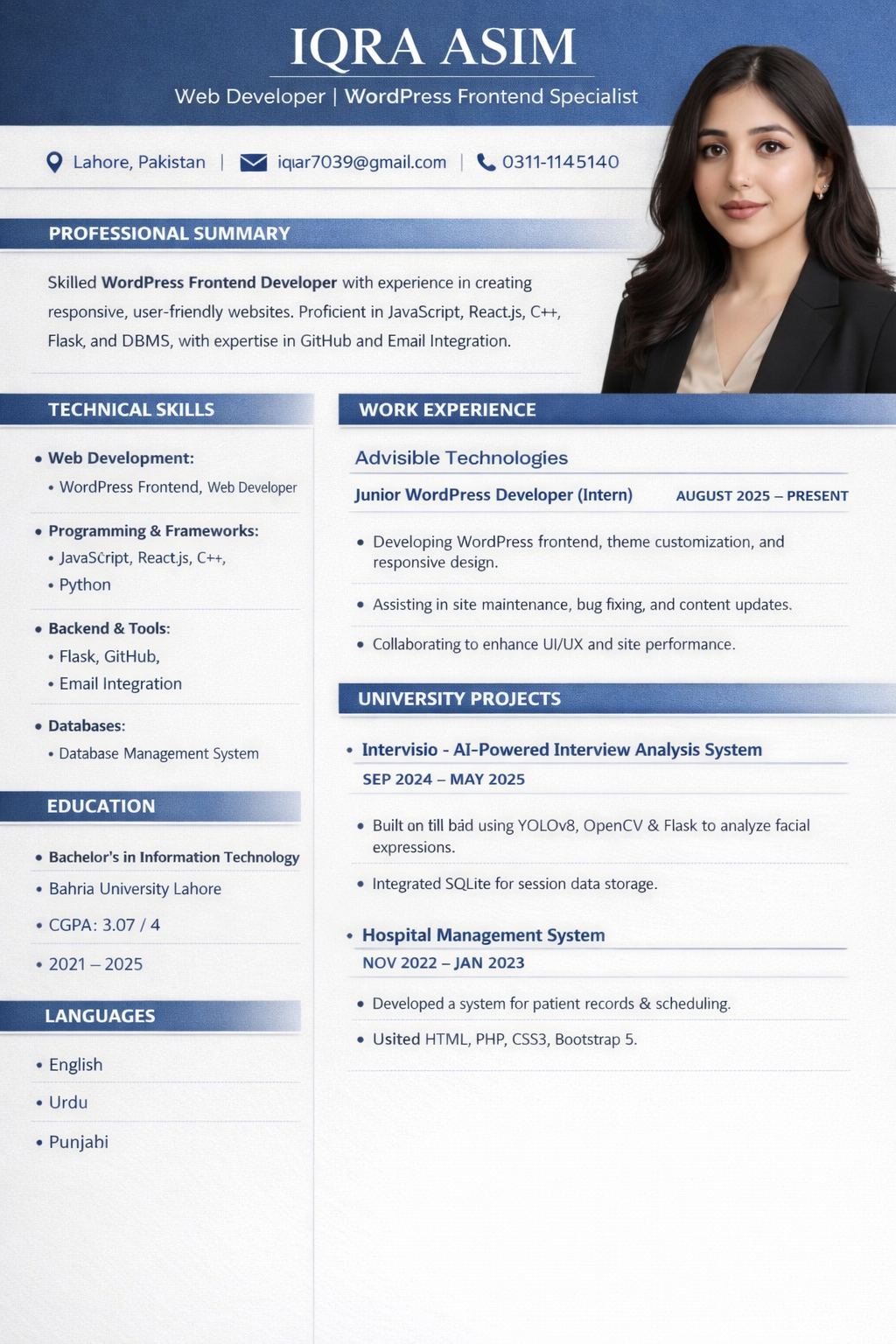 Hi, I’m Iqra Asim, a confident and dedicated WordPress Developer specializing in Web Design & Development. I design and build modern, responsive, and high-performing WordPress websites that help businesses establish a strong and credible online presence. I have a strong passion for transforming ideas into fully functional digital platforms. From concept to launch, I focus on clean design, optimized performance, and seamless user experience. I believe a website should not only look good but also work flawlessly and deliver real value. I take pride in my attention to detail, problem-solving skills, and commitment to quality. I consistently go the extra mile to create unique, scalable, and user-centric WordPress solutions tailored to each client’s goals.